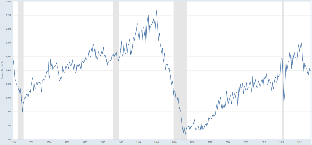 Above – you see the new housing starts, and how they are down from the peak in 2022. You can see how the trend up was going from 2009 to 2022. Or – 1991 to 2006. It stands to reason that we could be seeing the end of this housing boom for some time. In the chart, you could see this number crashing for 2+ years. We may be just starting that decline now.