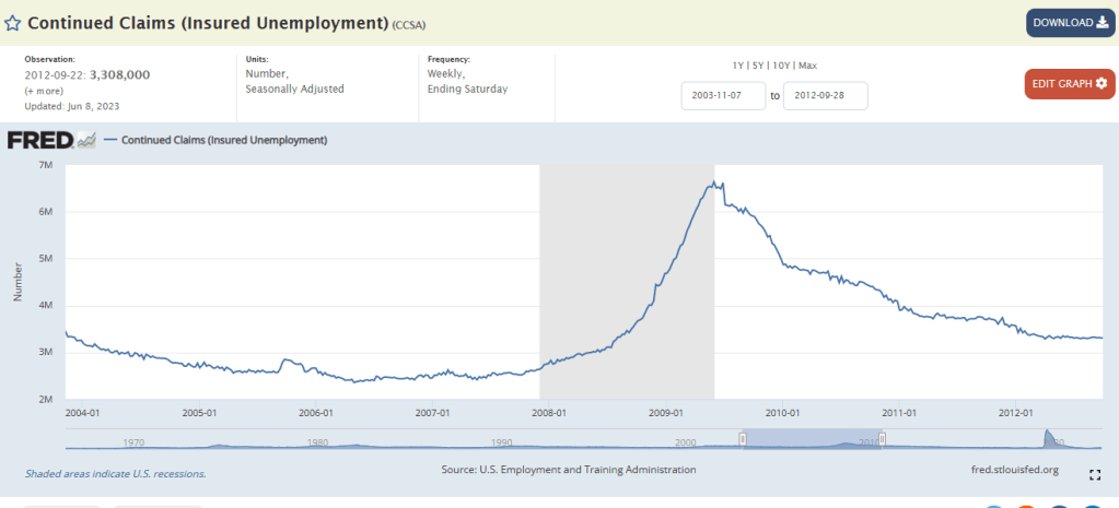 If you look at Fed Funds rates, you can see the gradual incline of rates peaked at 2007 and held at 5%. Meaning, there was a lag time where the unemployment bomb hit 6-12 months after peak.