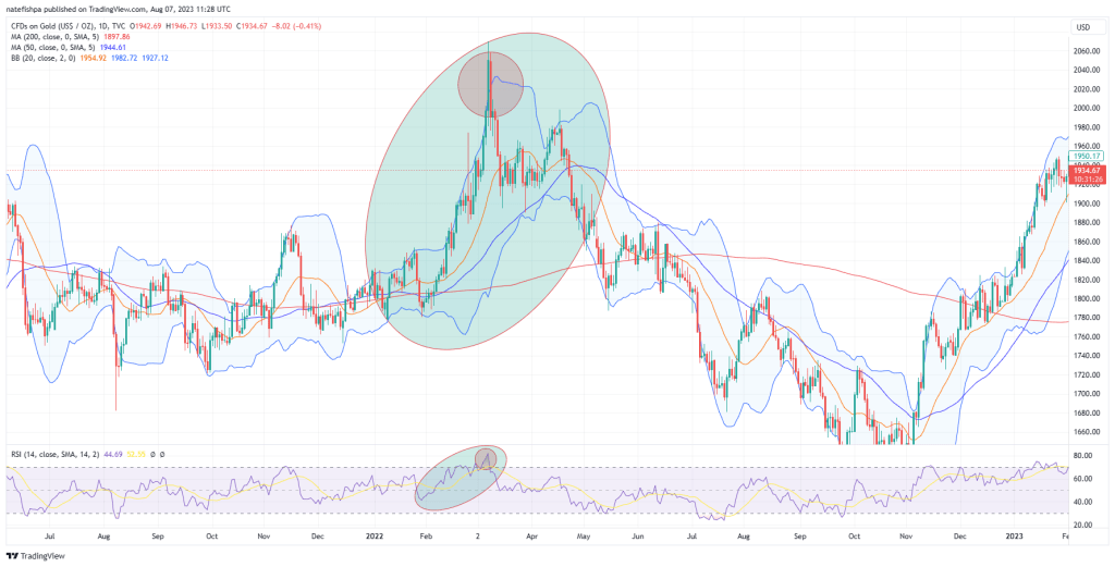 You can see that all the way up, it was trading at the top of the bollinger band. You can see RSI at the bottom going way high. You can see how high over the skis are from the 50dma and the 200dma.