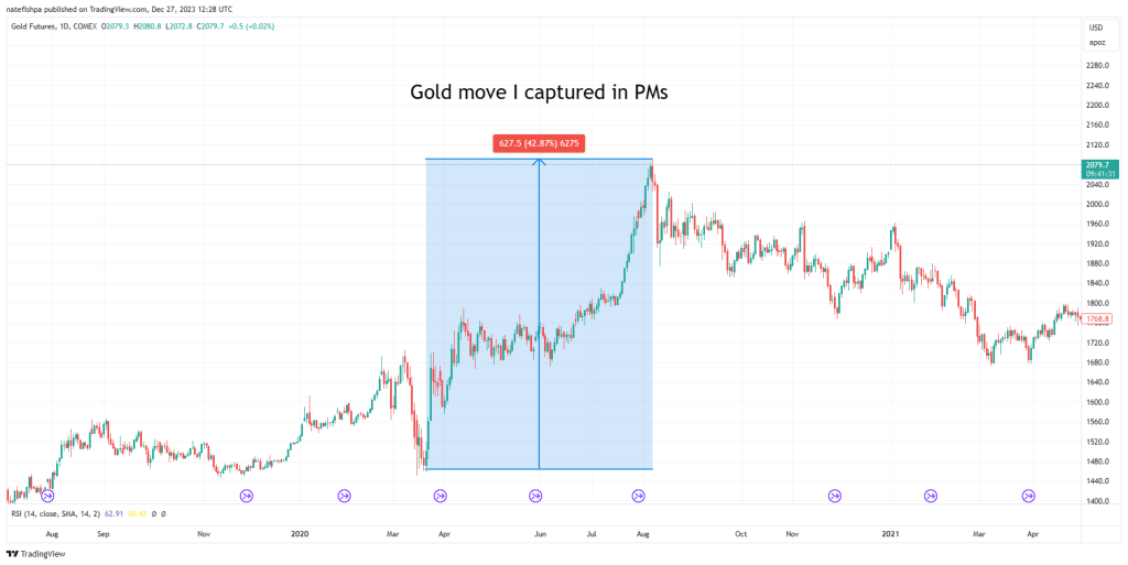 This was a 42% move up in gold. I didn’t hit the exact bottom, or top, but got pretty damn close. All of the senior metals analysts were screaming from the rafters about closing their positions or trimming them. I was scared of another March 2020 move, and with them, I sold off half. I had gotten a lot of 2xs, some 3xs, and maybe 1-2 4xs. Most of these were junior miners, but I had also dabbled with some call options on majors that went nuts.