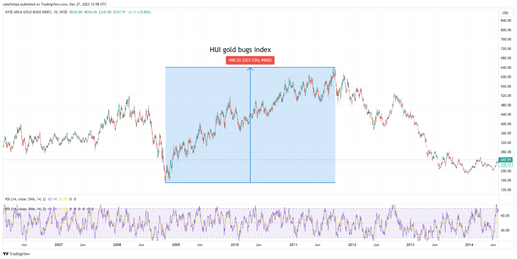 Here, I use the HUI gold bugs index. What you see with this is the MAJORS. You can see over a period of about THREE YEARS the move in the majors went up 327%, or about 4.25x. This is the MAJORS, not minors. These tend to go up a lot less than the minors.