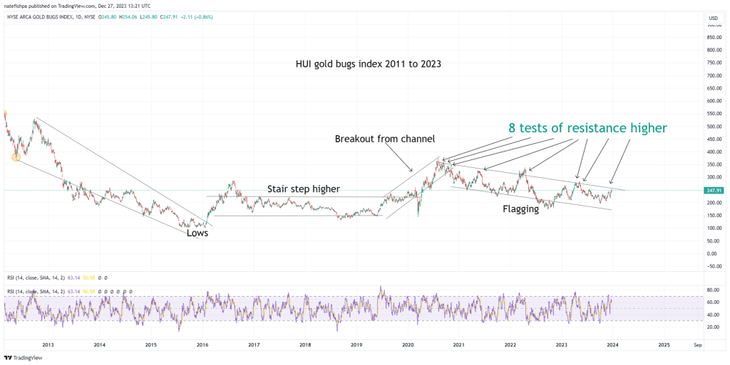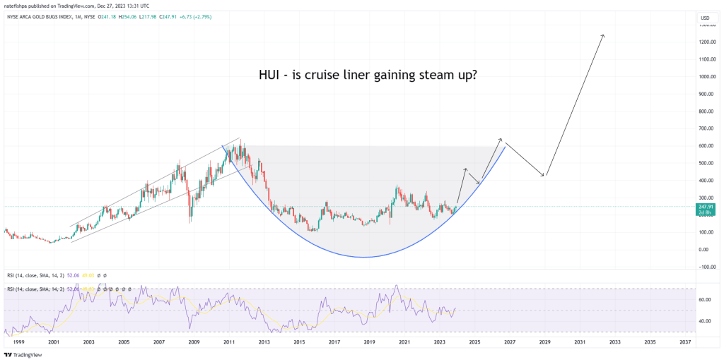 You can see the strong move from 2001 to 2011. While I only covered 2008 to 2011, it is reasonable here to see that this is a form of cup forming. Maybe it won’t, and break down. But let’s recap from the 50,000 ft view. We are at a point where the pivot is about to happen – and we all know that gold tends to explode during this period of time, anticipating more inflation and debt. It therefore is VERY reasonable to have a thesis here that things are about to explode up in the sector. But – like 2008 to 2011, this isn’t vertical. Maybe it is a shorter move like from 2020, but when it comes down, it then “touches” the wall and explodes higher for a move?