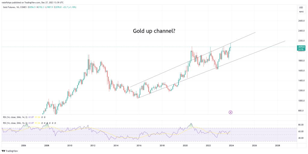What then happens is a breakout up from the flag and it stair steps higher to a higher sideways trading channel. If you are a pro, you are making money on the up and down sides of these. But then the move after 2020 happens, and this is a breakout of THAT channel. The last 3 years appears to be a flagging channel. Bull flag maybe – will it simply explode up to a higher sideways trading channel? Or – can we perhaps envision building a giant cup here.