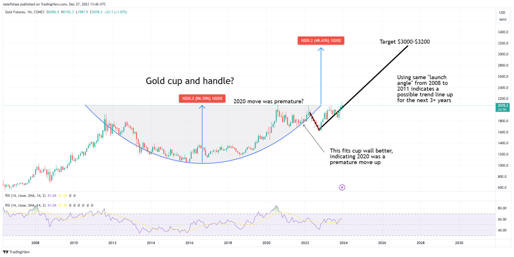 My targets may not be in line with how the cup and handle is strictly done, but my feeling here is we will be running a lot more hot than not. IF we are in a 3-4 year move, and IF we use the same types of move angle from 2008-2011, we can see we are knocking on $3000. That would have this gold move from 2015 from $1000 to $3000.