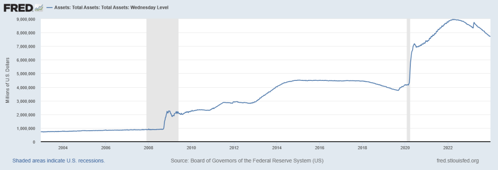 But what if in 2024, less and less countries want to buy treasuries? Would that not insinuate that rates would go significantly higher? Yes – only if the Fed doesn’t intervene. Remember, banks are underwater, a lot, on the notes they bought. The Fed had to bail out banks by essentially giving them a warm blanket of reassurance. Yellen keeps plotting on, and Powell is then left to clean up the mess. Powell has said many times, he doesn’t plan on buying more debt. In fact, he wants to take the balance of the Fed down, a lot.