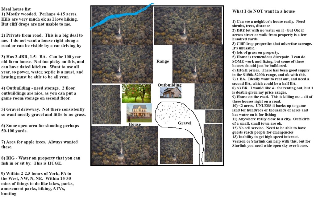 2. Most of the properties I have seen are 1 acre lots as part of shared communities. Too many people. Too dense. I want more land than that.