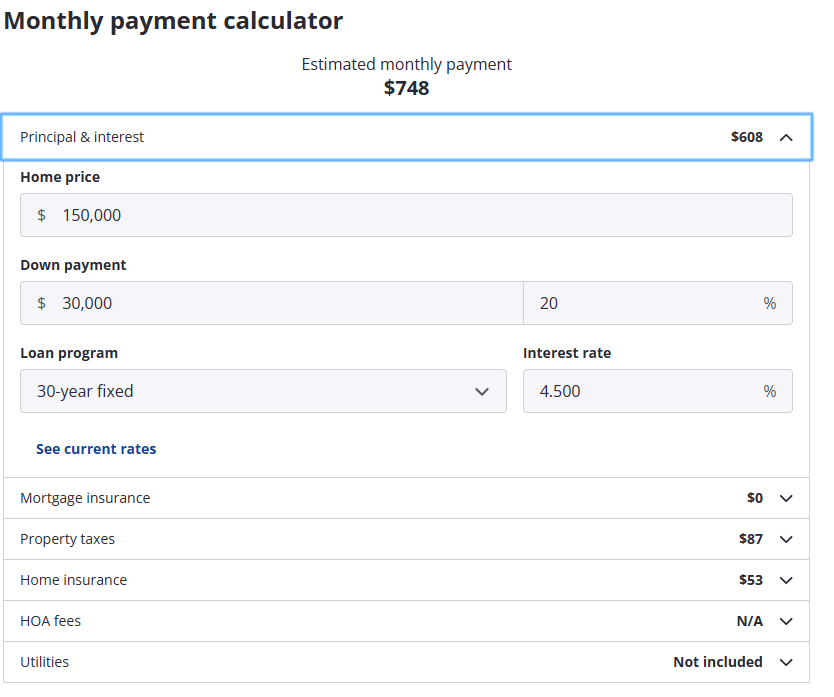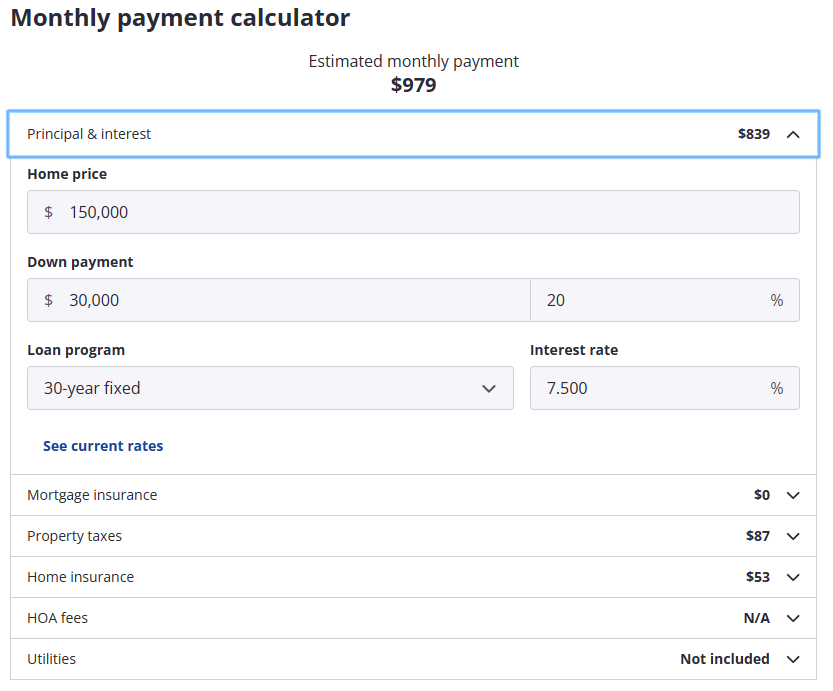 Now if you put 20% down with the same parameters, you get $979 per month as you have less to borrow and no PMI.