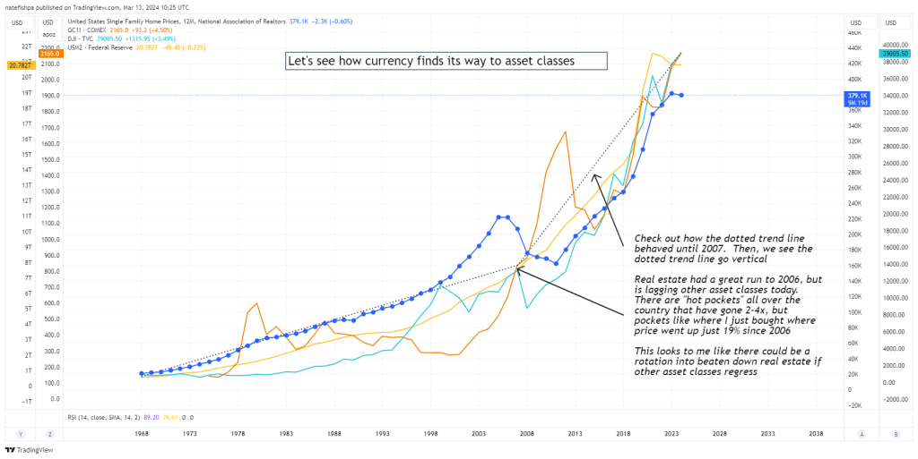 With the chart at the top, I started to track relative performance from 1968 or so – which is about the best I can do on data. What you see here is the blue dotted line (real estate housing price index), orange line is gold, turquoise as Dow, and yellow line as M2.