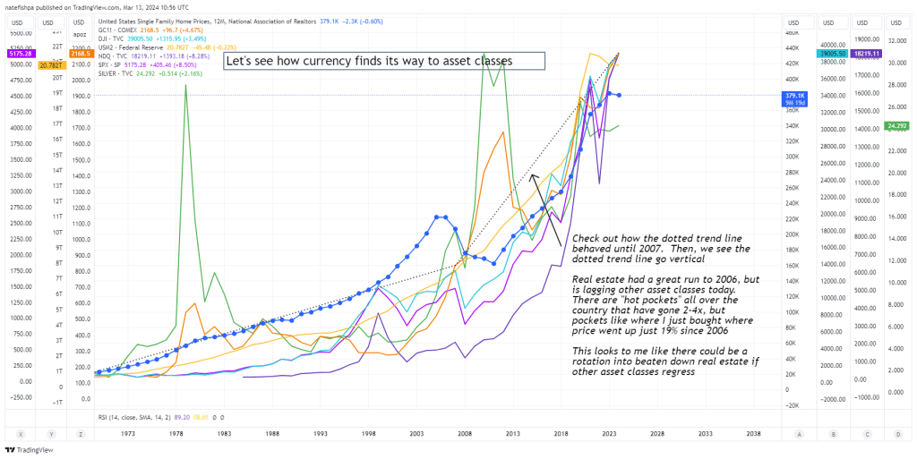 If you look at the blue dotted line today, you see it is lower in relative performance than gold and stocks – using the Dow. I’m going to add the Nasdaq and S&P below in a bit. What most understand is that many in 2021 bought up houses at inflated prices with low interest rates to do AirBnB – and many of those may soon crash down. But these are pockets of the country with massively inflated prices – with the rest of the country not in a bubble. This had me buy a short term rental last week, far – far – far away from any kind of AirBnB bubble areas. I was wayyy overexposed in metals, and with the sale of one of my long term rentals in August, I wanted to pivot to a vacation home/AirBnB/rental to have a place to go in times of chaos.