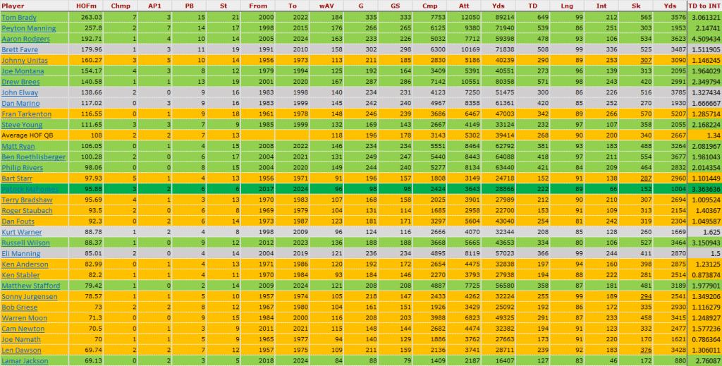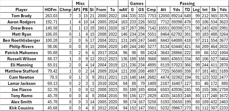 If you look at Pro Football Reference HOF tracker, let’s look at the top 15 or so they have listed. These are recently retired players or still playing.