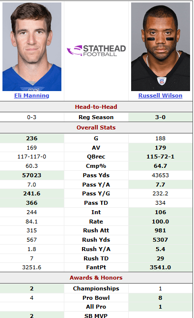 Even Russell Wilson crushes him. Eli has 50 games on him, and Wilson will catch his yards – but look at that rating???!!!