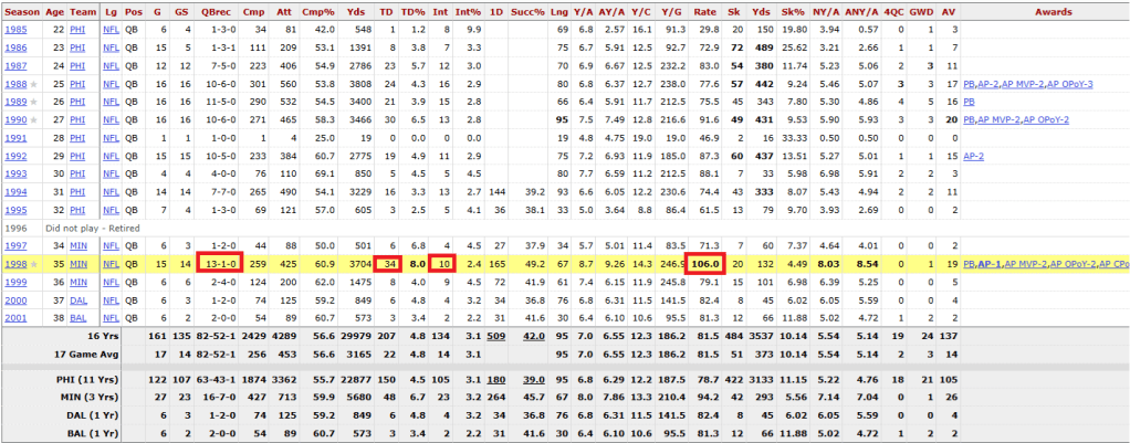 His best year ever, by a mile, was in 1998 when he was 35. That year, he had Cris Carter (like when he had on the Eagles) but also had Randy Moss. Wait. Both of them are in the Hall of Fame???
