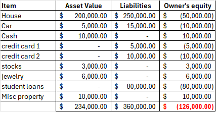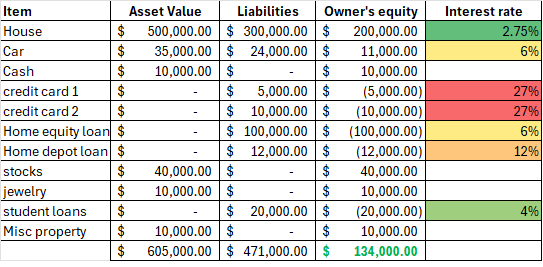 So if you are at negative, it’s not the end of the world. But you obviously want that to be green. In this example, you can see that the note on the house is more than the value of the home. This happened to me in 2008 after I bought a home in 2007. You should know that you cannot really sell your house if you owe more on it than it is worth. I ran into this in 2009 – during the global financial crisis when I lost a job twice in the same year. You have to get permission from the bank to “short sell” – which essentially puts a bankruptcy on your credit. At the time, I worked for the DoD and had top secret clearance, so if I declared a bankruptcy of sorts, it would have cost me my job. And – you are an insider risk threat if you have poor financials. So – this can also prevent you from getting decent paying work for maybe 5-7 years or more!! So – you have to understand that in today’s world, assets can inflate in market value one year, and the next year deflate.