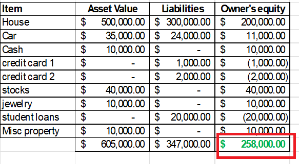 In column 1, tally up the values of assets. In column 2, tally up your liabilities. In column 3, subtract column 2 from 1. Then, auto sum the items: