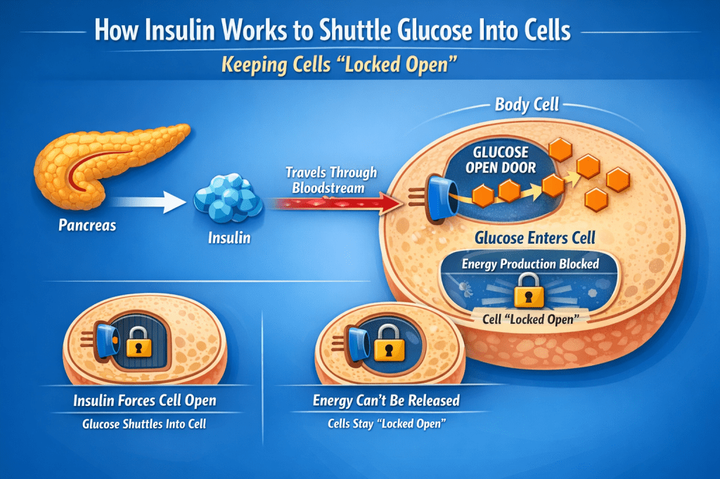 With this – insulin carries excess glucose from your blood into cells. When it is doing this, there is a cell door locking the door open so you can’t access the energy from these cells at that time. If your blood glucose levels get to low, glucagon is released to get glycogen from your liver or glycogen stores.