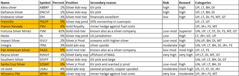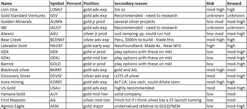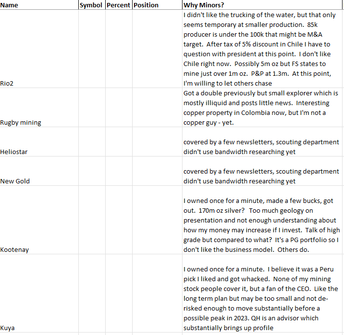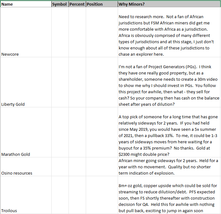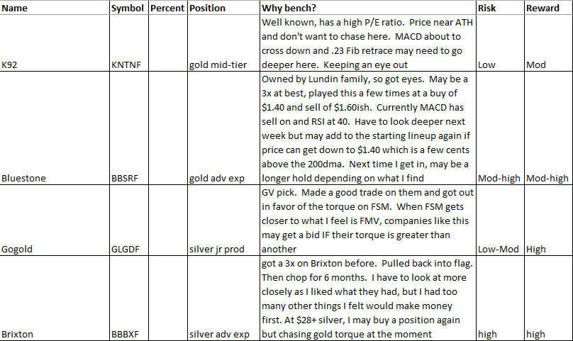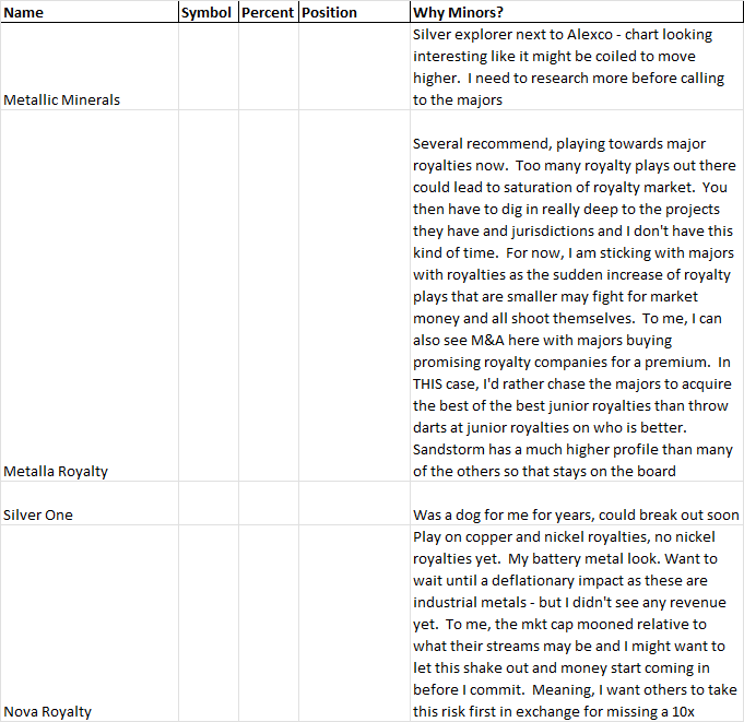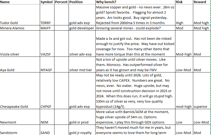 On THIS page, I wanted to list the nuts and bolts of a portfolio focused on getting me lots of torque, NOW! Many stock pickers have these lists that are quality miners, but may have different timelines than me. The problem I’m trying to solve here for me is monthly gains, not yearly portfolio gains. With this, these picks have more risk than buy and hold for 2-4 years. Additionally, I prefer to try and capture gains before a downturn and rotate some or most profits into another horse I feel might be better performing – meaning my tax implications with capital gains tax are more than a buy and hold for years type of person. Consult your financial analyst before all decisions. This is NOT financial advice, but is put out there as an educational tool so you can see how someone might construct a mining stock portfolio, and one that might have torque in the near term rather than long term.