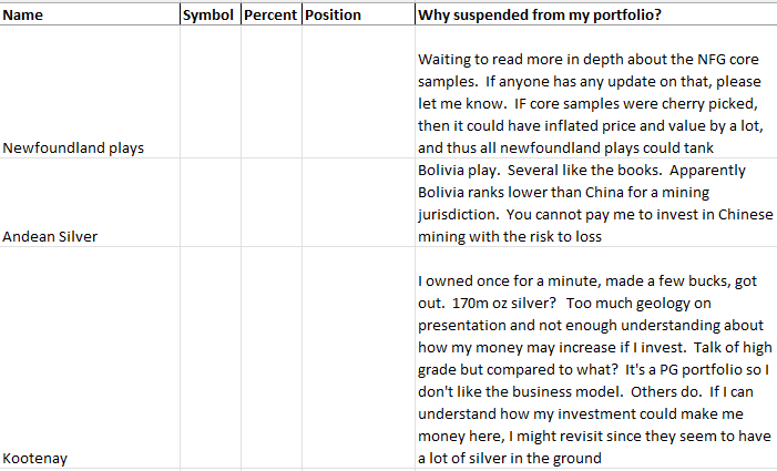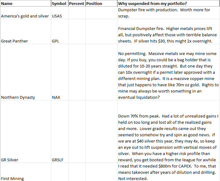 | 3/18/2022 | Added Troilus to the starting lineup – I placed a position yesterday, but with the FSM margin stuff, got out quick to free up cash. Updated my Troilous info – the info I had was confused with another stock – neither of which I had owned for 18 months, so it was good to get the refresher. Added “Banned from the league” for items that are too disastrous to touch at the moment. |