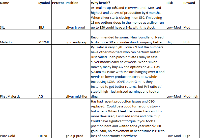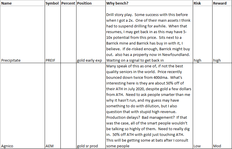 | 3/14/2022 | Added AG to starting lineup from bench for 8% of portfolio to play possible silver melt up. Looking to add AEM at some point and may rotate out of something if MACD signals to get out |