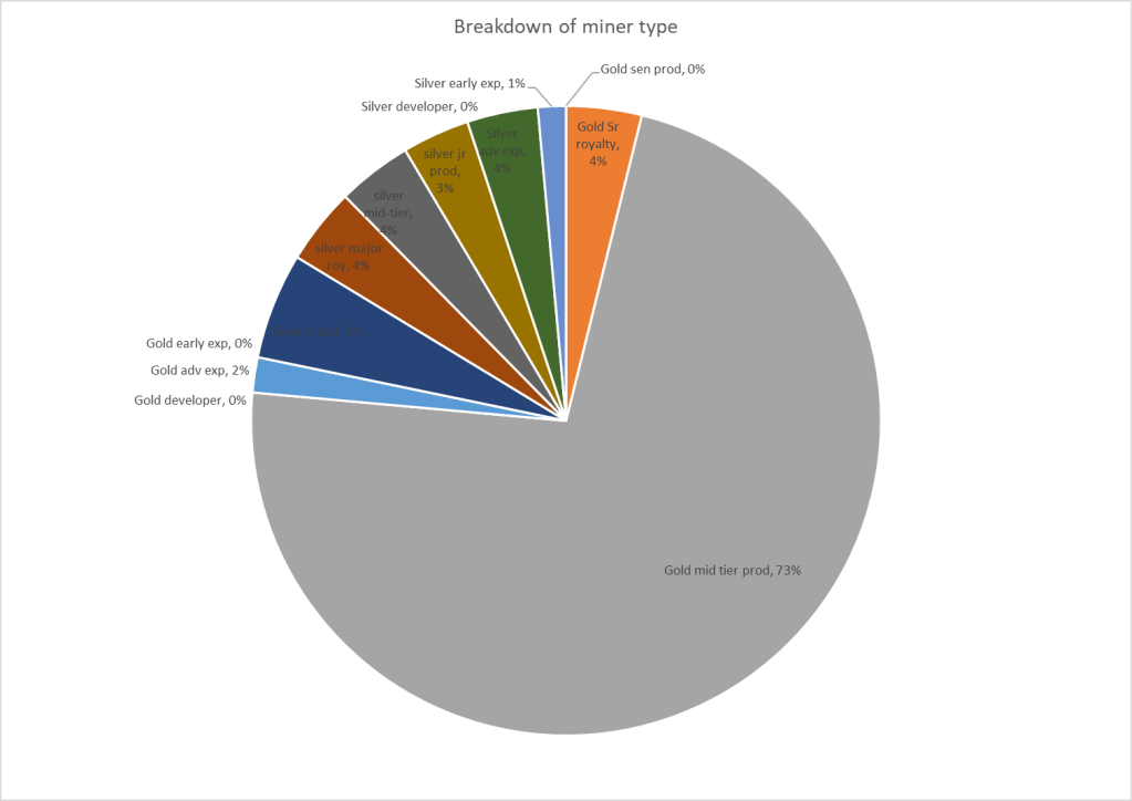 So I don’t just go out there and fire out all junior explorers, or senior miners. In the former case, it is super high risk to lose all of your money over time. In the latter case, your portfolio could be like watching paint dry with adding grains of sand to a beach every week. So I sought to have a balance in the portfolio that for me favored producers/streamers with the most torque and then add in the best quality explorers/developers I could which have the best near term setups.