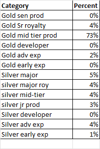 I will have a mix usually of mid-tiers gold producers, mid-tier silver producers, maybe a handful of junior gold/silver producers, a SMALL number of developers and a SMALL number of exploration – percentage-wise. Think of what you might have on a baseball team. You might have a great leadoff hitter than gets on base a lot. A number two hitter who is quick and is a great bunter. A number 3 hitter with some pop, but drives in runs. A number 4 hitter who may not bat for the highest average, but when he does hit it, the ball goes a long way.
