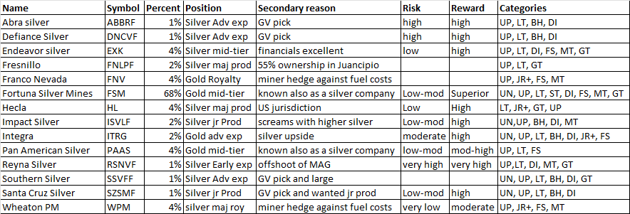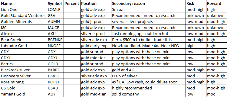 One thing to think about with your starting lineup is where these companies are. If ALL of your starting lineup is Mexican silver companies, and Mexico nationalizes all silver companies, your portfolio all goes to zero.