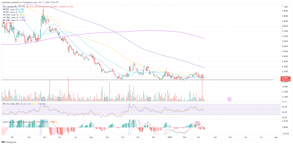 Unloved, expecting some dilution soon due to low cash which shows why the chart is so low. Two great projects, but I think the idea here is investors are waiting for the dilution to hit and then later buy in. Not chasing. Lots of sell volume the other day. RSI 30 or lower I’m looking to DCA in. Could be a 4x, so whether I get it at $.28 or $.25 doesn’t matter, but I don’t want to actively catch a falling knife, but perhaps de-risk it a bit by letting others find that bottom. Tough call. I may put in a stink bid at $.20 to see if I can get any on market liquidation, but I may also love the low RSI and see a MACD buy signal. Need to know more about their cash burn situation and possible dilution they may see soon. But projects and numbers look solid for a massive torque move.