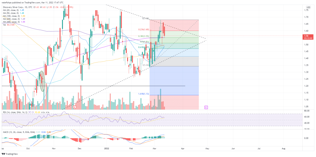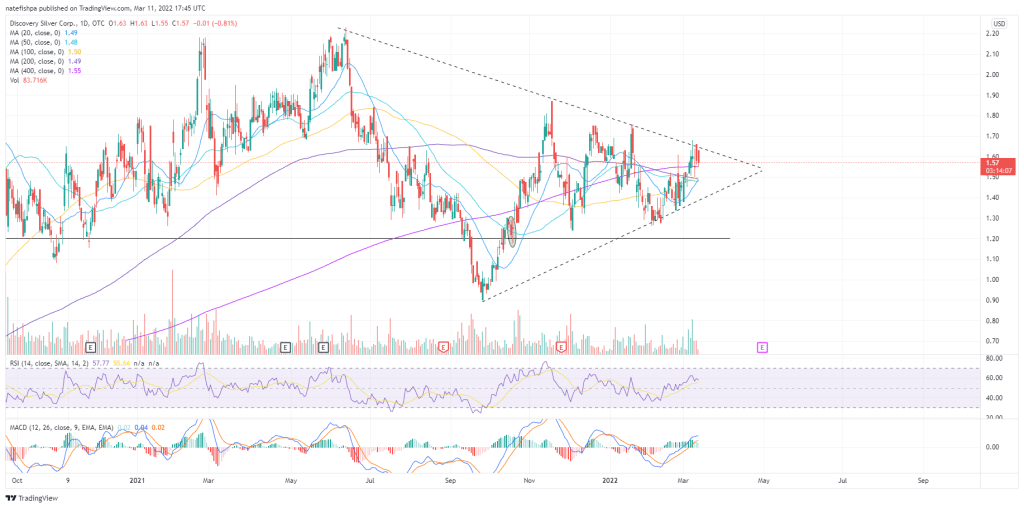 Discovery is one I want to hold, but I end up trading it. The last time I sold it was for more FSM. This triangle is probably going to explode up. Probably, but no certainties on a triangle like this. 50/50 showing compression in price. Higher silver price should be the deciding factor up. MACD is looking to cross over down, recent run up could not escape the triangle. price now sitting above a declining 200dma. Can probably get for 5-10% cheaper, then it explodes up. But we also have a deflationary risk of stock markets, which could take silver into the teens. That would take the triangle down of course. So – probability-wise, I’d like to let this cool a tad more and not take on that 5-10% overhang. But powder keg is set.