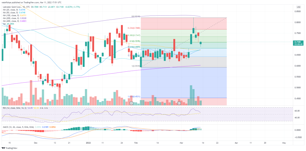 Watching LAB closely, setting alarms for $.65 and might put a stink bid in for $.61 to see if I get any bites on market sells. A gold sell off could take this into the $.50s on a liquidation, and drill results that are stupendous could double that price in a day – so this is my top Newfoundland play for now.