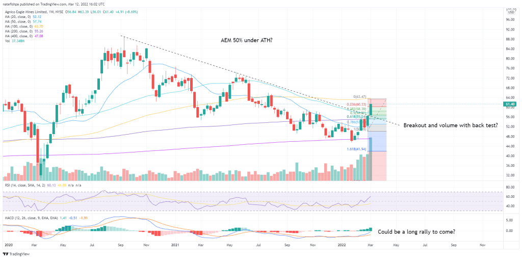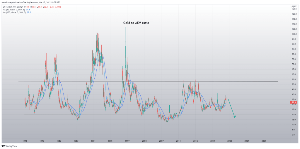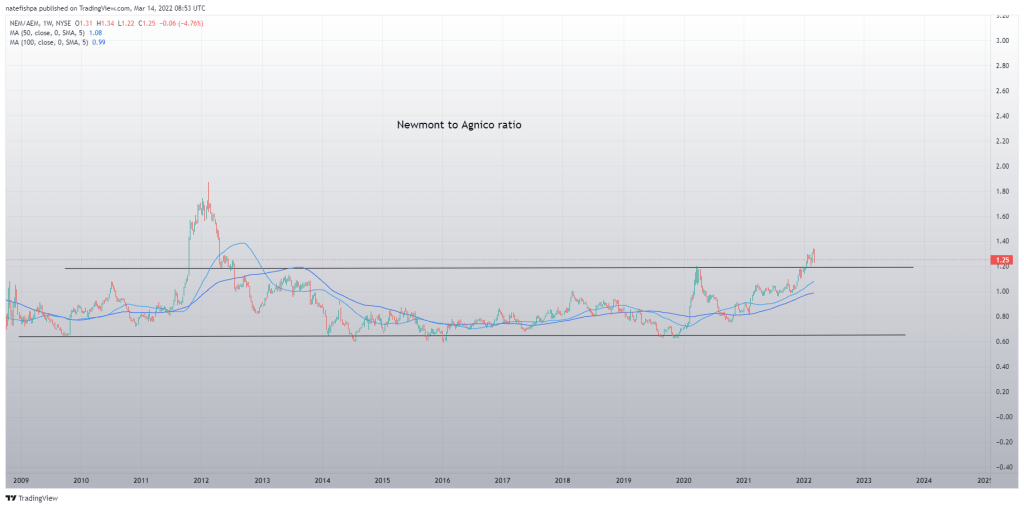 The above shows the gold to NEM ratio – and for me, NEM is cooking hot. IT could go more, but to me, it’s like a filled glass of water. Any water added now spills over. This is how Barrick is only 20% off of its ATH, but can see that moving up more. But AEM 50% of its ATH tells me water is about to flow to them.