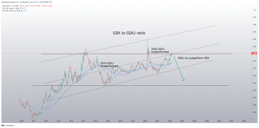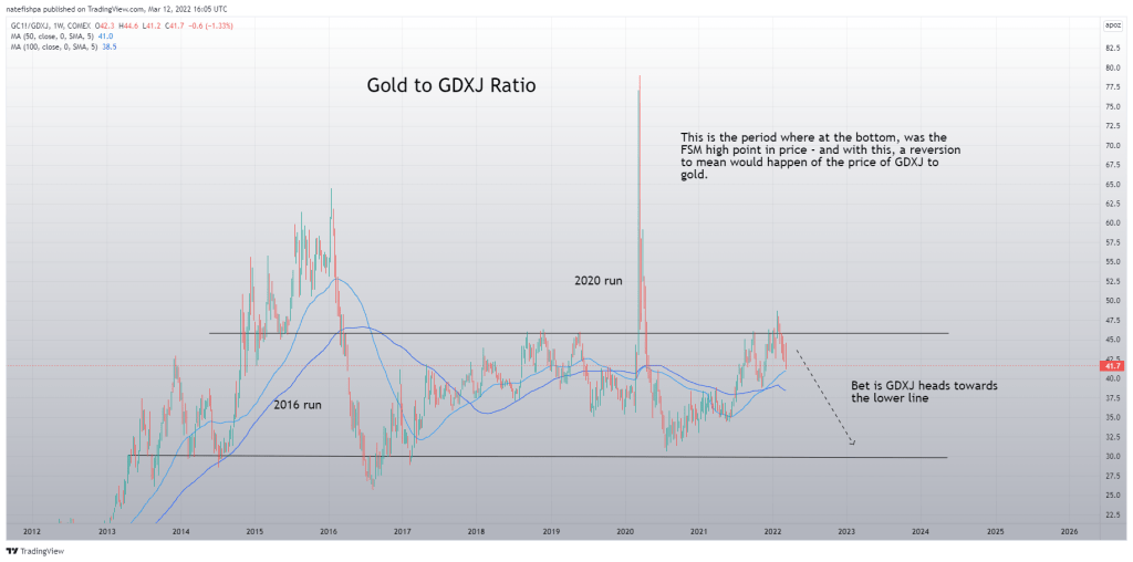 We can then use this ratio to look at things like gold to GDXJ and more important, GDX to GDXJ.