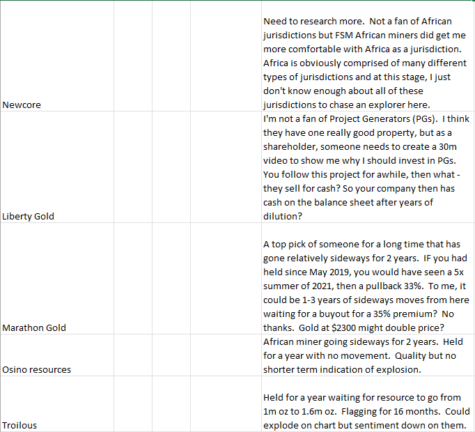 The bench – These are companies that mining stock guys have picked and just don’t move. I have a ton of these that are liked for long term plays, but just sit there collecting dust. It is POSSIBLE if an M&A cycle heats up, that some of these might get 35-50% premiums. I’m not really interested in that. I held Wesdome for a year, lost 15% on it, and hoped it would be taken over for 35% increase. I’m sorry. That kind of mining stock investment is not for me. Now, if gold makes a move to $2200, could Wesdome double? Yeah – but majors get their beak wet first, right? So why am I putting valuable dollars into a placeholder that is not moving anywhere? I’m not. But, I still have companies like this I’m aware of on the bench that can get the call to the on-deck circle if things change.
