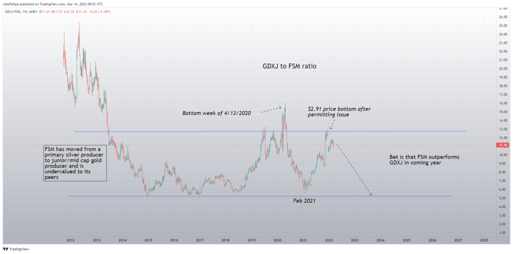 In fact, if you look at the price of FSM – the last 5 times it was around this share price, gold was increasing the entire time. One could make the argument, today, that FSM is priced for $1500 gold. They are a gold miner who makes a lot of gold that no one knows about. My contention is that this share price is about to have a reckoning one day that will be biblical to the hockey stick up side.