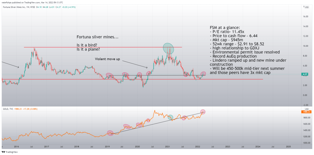 Lastly, consider this chart where the price of FSM was near $10. Gold was $1840. Gold has been flirting $200+ higher recently and the share price is half of that.