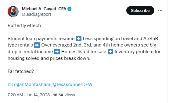 32. Student loan payments resuming. I forgot about this, but this is also going to significantly reduce a lot of discretionary spending that people have. For example, my payment is $400 or so – this is less I can spend into the real economy. That will hit like a ton of bricks.